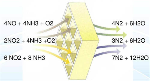 SCR脫硝設備主要由反應器、尿素存儲罐、尿素噴射箱、噴射柜、噴嘴、SCR控制、SCR反應室等部分組成。當煙氣經過SCR反應器的催化層時,發生選擇性催化還原反應。